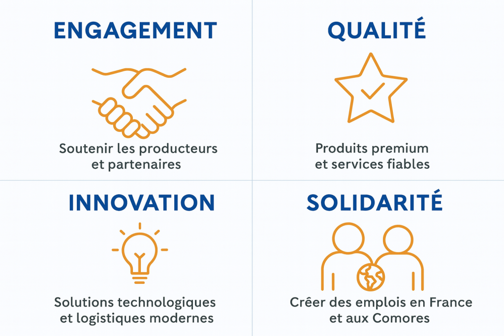 MOISSI des Comores, SASU basée à Cachan (France), est spécialisée dans le négoce international entre la France et les Comores. Nous importons et exportons des produits stratégiques (vanille, clous de girofle, ylang-ylang, produits alimentaires, matériaux de construction) pour répondre aux besoins des particuliers et des professionnels.